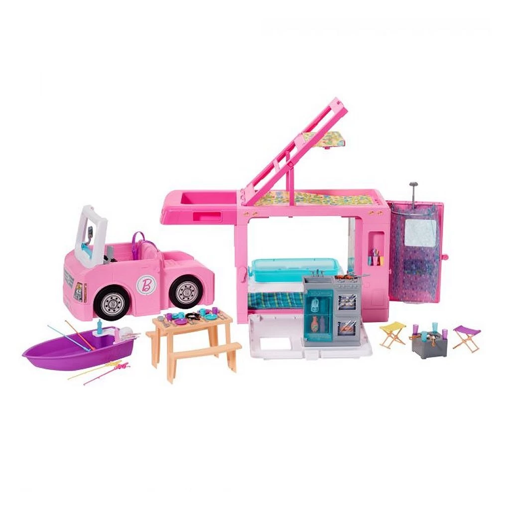 Ga samen met Barbie en haar vrienden op avontuur met deze Barbie 3in1 droomcamper speelset