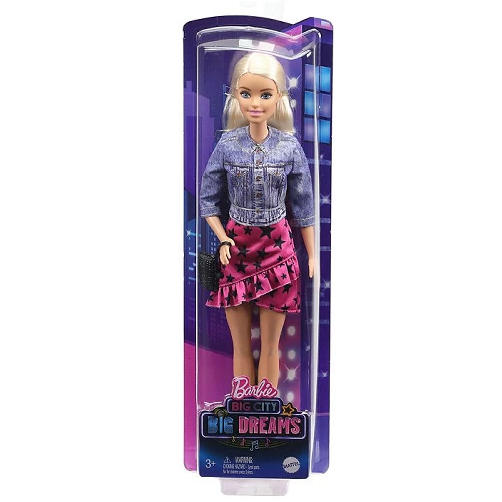 Barbie-pop Malibu draagt een denim-geïnspireerde jas en een stijlvolle rok met een sterrenhemel print en ruche details. Casual witte schoenen zijn perfect om de stad te verkennen, en een stijlvol zwart polsbandje maakt haar trendy look compleet. geschikt voor kinderen vanaf 3 jaar.