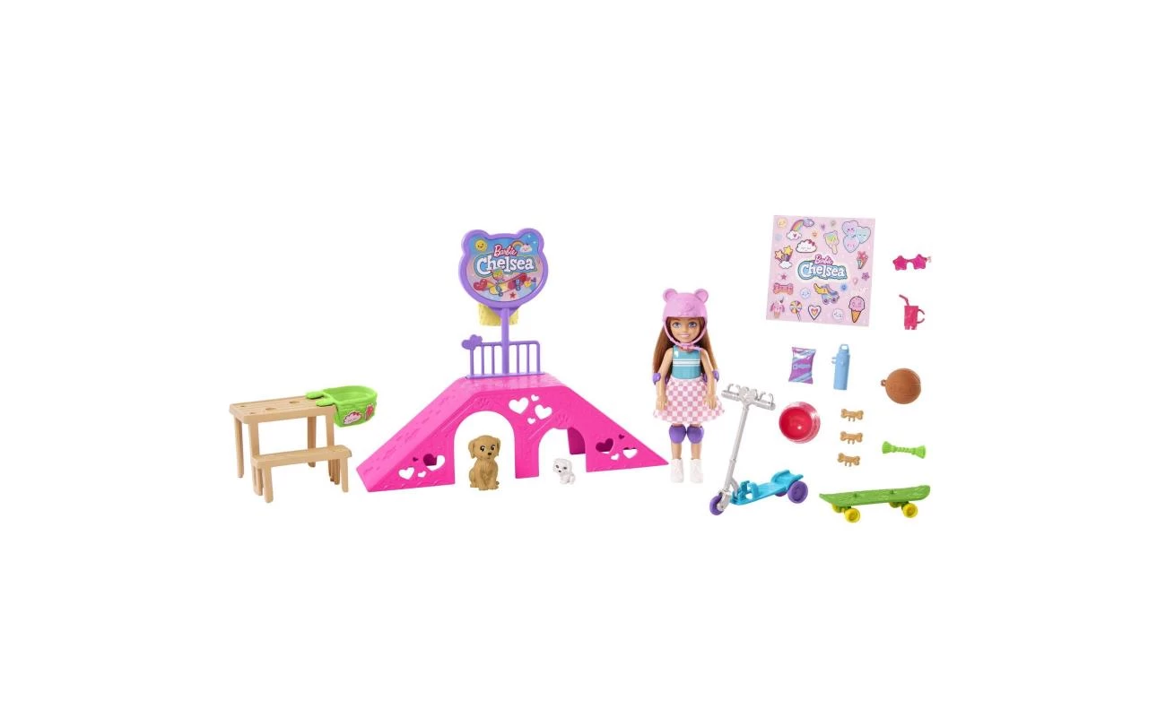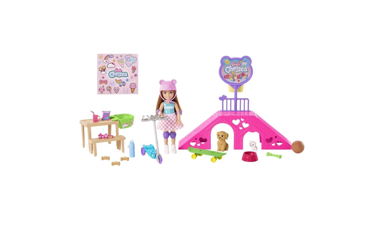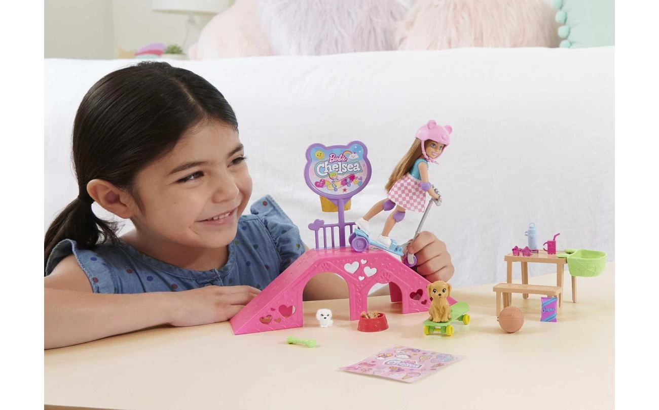 Chelsea en haar twee puppy’s staan klaar om naar het park te gaan en de skatebaan te bestormen! Met een step voor Chelsea en een skateboard voor de twee hondjes kunnen kids allerlei stunts uitvoeren en avonturen bedenken. In het park vind je een skateramp, een picknickplek, een basketbalring en allerlei andere accessoires. Met het stickervel kun je de set versieren. Pop kan niet los staan. Kleuren en versieringen kunnen variëren.