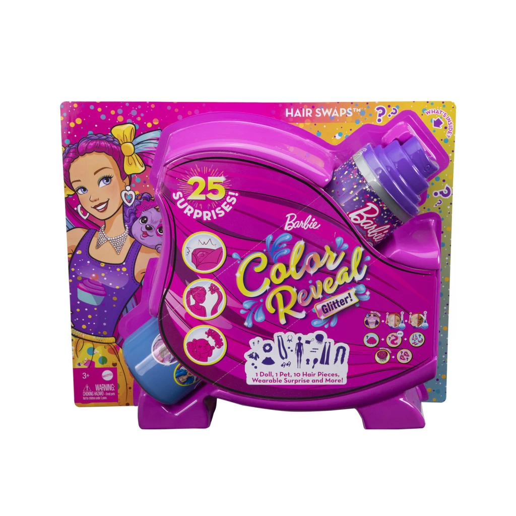 Barbie Color Reveal Glitter Hair Swaps. Met 25 verrassingen. Stop de pop en accessoires in water en zie welke versie eronder zit. Inhoud: 1 barbie pop, 1 huisdiertje, 10 haarstukken, haaraccessoire voor jezelf en meer. Geschikt vanaf 3 jaar.