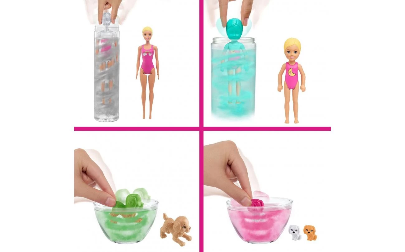 • Als alles is uitgepakt, wordt het tijd om de poppen en huisdieren tevoorschijn te halen! De kinderen halen de Barbie Color Reveal pop uit de buis en vullen deze met warm water, dompelen de pop vervolgens in het water en draaien haar rond; het water verandert van kleur en haar echte look komt tevoorschijn! Herhaal dit voor iedere pop: welke kleuren ga jij onthullen?