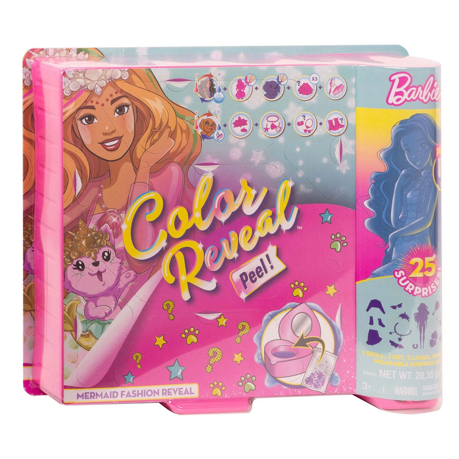 Barbie Fantasy Fashion Zeemeermin. Deze Barbie Color Reveal Set Zeemeermin bevat in totaal 25 verrassingen. In de set zitten verschillende zakjes met verrassingen: kleding en accessoires, een dier met een kleurveranderend effect en thema-accessoires. In de set zitten ook twee accessoires voor de eigenaar van de Barbie-pop: een armbandje met amulet en een roze doosje.