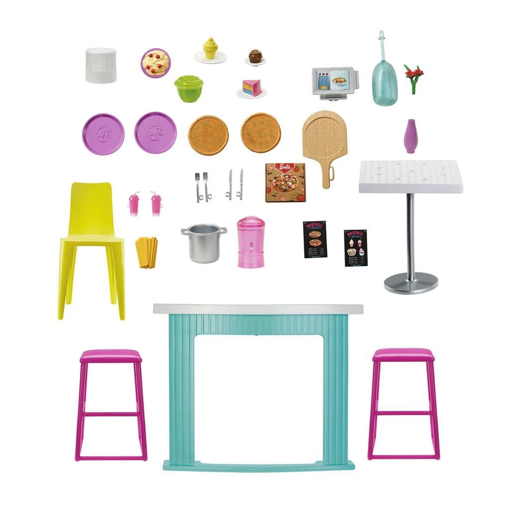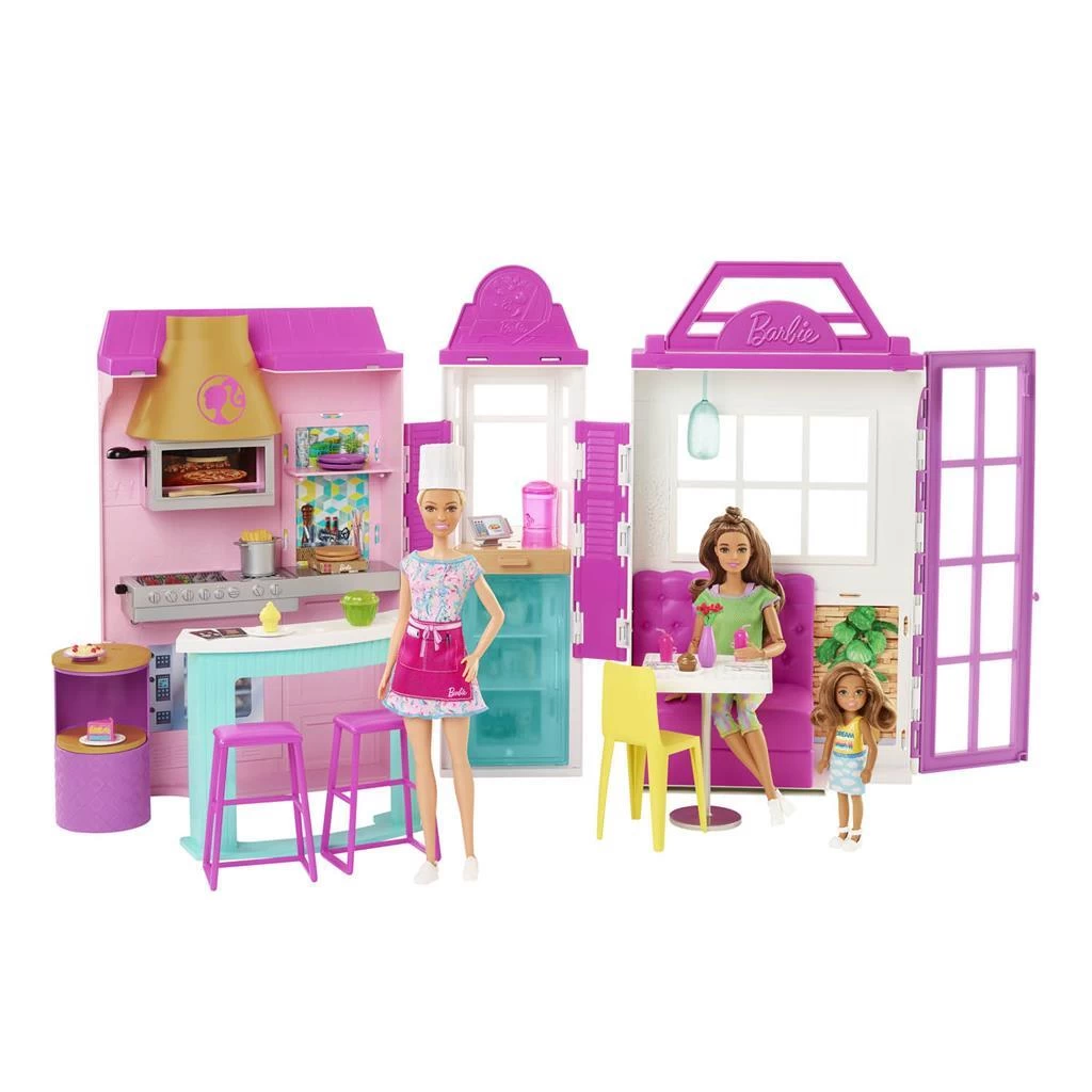 Jonge fijnproevers kunnen allerlei verhaaltjes opdienen met de Barbie Cook and Grill restaurant speelset! Deze set is op een café geïnspireerd en biedt eindeloos veel speelplezier dankzij het kleurrijke en moderne ontwerp, de 6 speelplekken en de meer dan 30 accessoires. Barbie is klaar voor een nieuwe werkdag in een jurk, een schattig roze schort en een koksmuts. Kinderen kunnen haar helpen bestellingen op te nemen bij het bestelraam of maximaal 4 gasten naar een tafel begeleiden bij de bar of in de zithoek. Vervolgens kunnen ze in de keuken hamburgers op de draaiende grill bakken, zoete lekkernijen op de draaiende dessertplaat leggen, een pizza in de oven gooien en kijken hoe deze van kleur verandert tijdens het ‘bakken’! Kinderen vanaf 3 jaar kunnen hun favoriete Barbie verhalen naspelen als kok, ober en klant, dankzij de meer dan 30 accessoires en eindeloos veel speelopties!