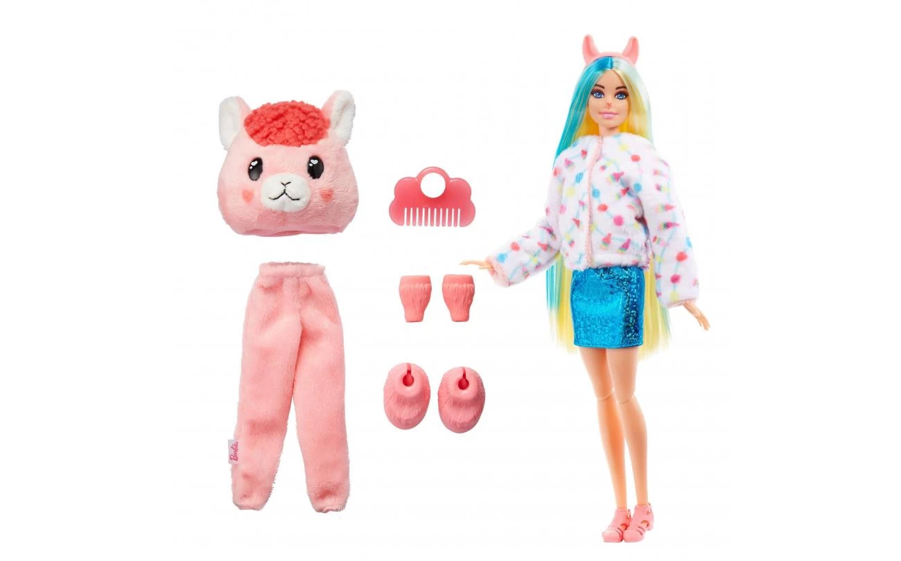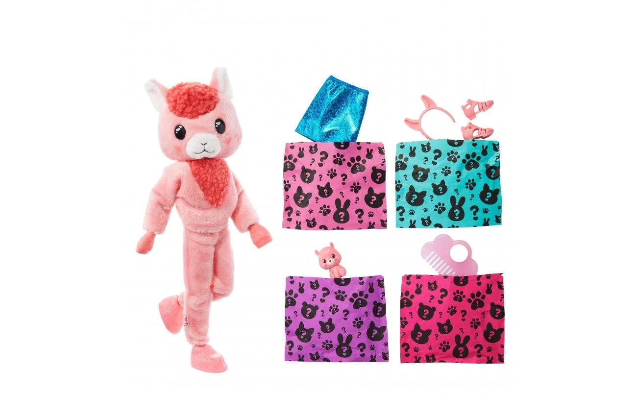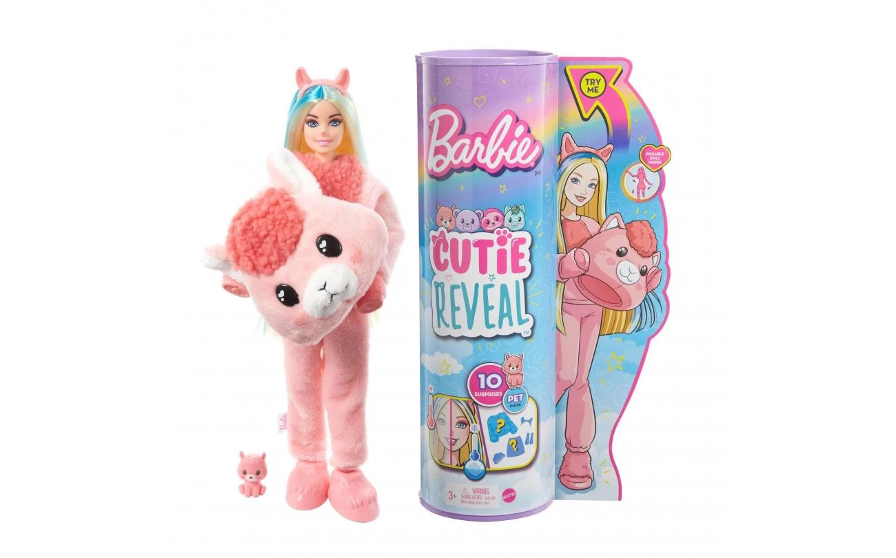 Barbie Cutie Reveal Poppen uit de Fantasie-serie hebben de schattigste uitpakervaring, met 10 verrassingen, inclusief beweegbare Barbie pop. Open de verpakking en ontdek een zachte, knusse lama en 4 verrassingszakjes. Als je het lamapak uittrekt, komt een Barbie pop met lang haar en glanzende glitters tevoorschijn. Open de verrassingszakjes om schitterende kleding, accessoires, een spons/kam en een minilama te vinden. Kinderen kunnen de Barbie pop aankleden en accessoires geven. Het bovenstuk van het kostuum kun je binnenstebuiten keren en als een superzacht fleecevest gebruiken en de kop van het kostuum verandert in een dierenmand! Maar er zijn nog meer verrassingen door de snoezige kleurverandering. Er verschijnt dierenschmink op het gezicht van de Barbie pop, en haar minilama doet zijn ogen open en dicht. Superschattig! Je hebt alleen de spons/kam en ijskoud water nodig. Met warm water maak je de verandering weer ongedaan. Ontdek alle schattige verrassingen met deze Barbie Schattige Verrassing-reeks. Inhoud: pop in dierenpak en 10 verrassingen. Pop kan niet los staan. Kleuren en versieringen kunnen variëren.