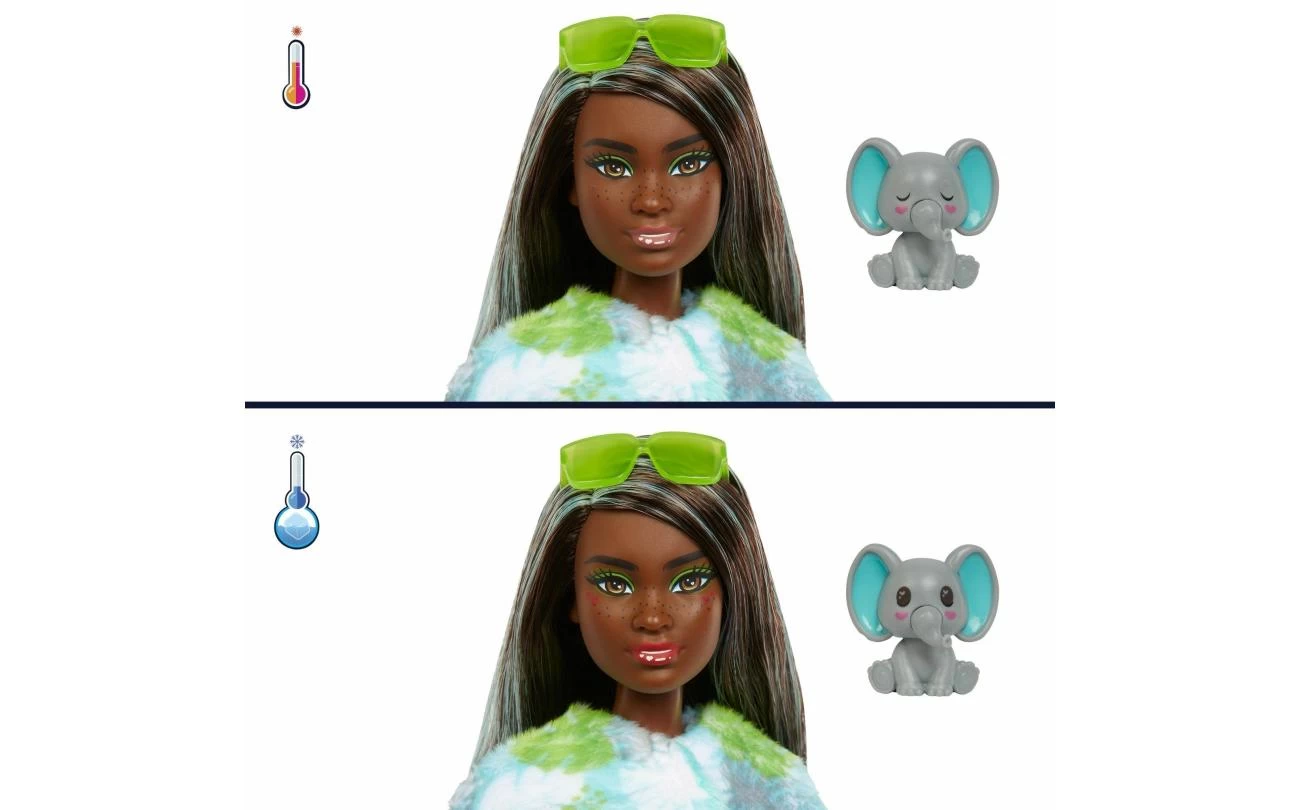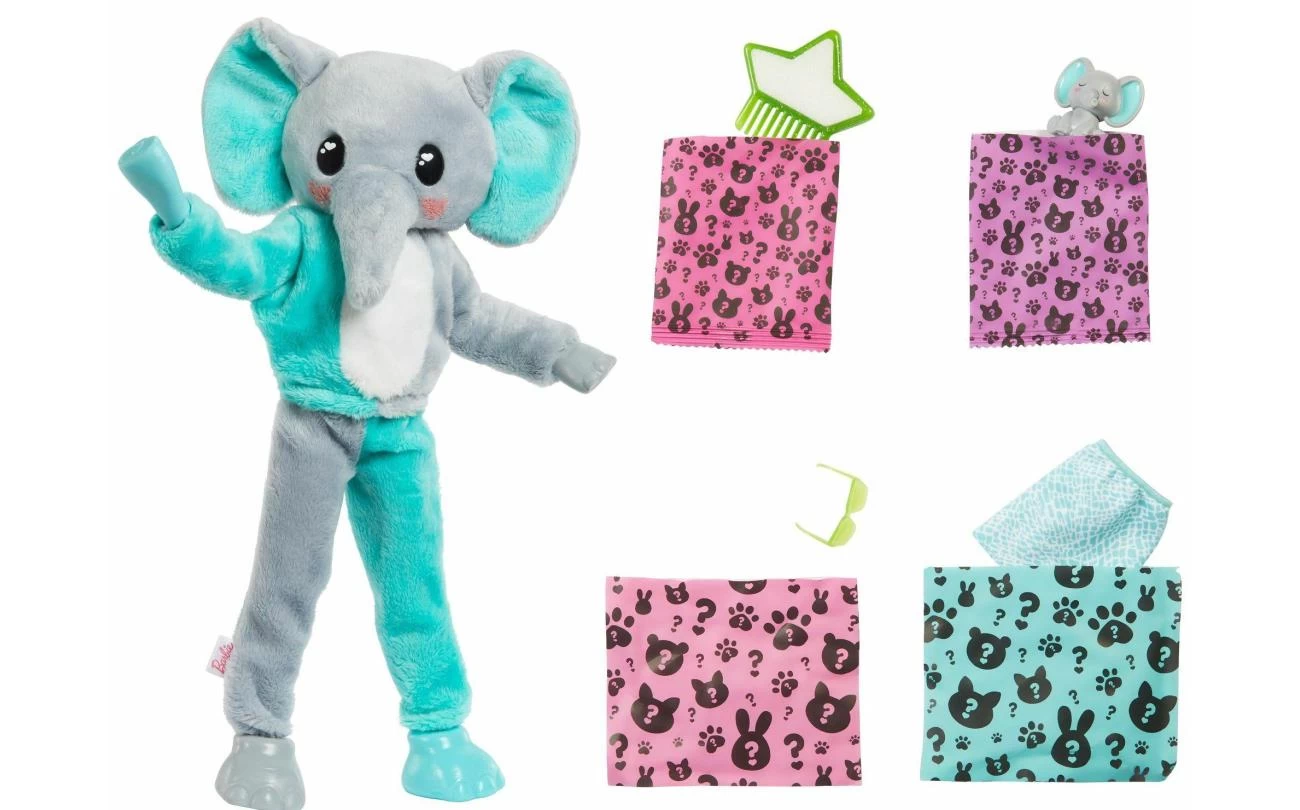 Barbie Cutie Reveal Jungle Series poppen bieden de schattigste unboxing ervaring met 10 verrassingen! Ontdek een charmante Olifant en verwijder vervolgens het pluche kostuum om een verstelbare Barbie-pop met lang, kleurrijk haar te onthullen. Elke Barbie-pop wordt geleverd met fonkelende vormen op het gezicht die de Cutie-look versterken. Leef je uit met meer verrassingen om te openen, zoals een zonnebril, een rok of korte broek en een mini-huisdier dat bij het kostuum van de pop past. Kinderen zullen dol zijn op het ontdekken van alle schattige verrassingen in deze op de jungle geïnspireerde Barbie Cutie Reveal serie!