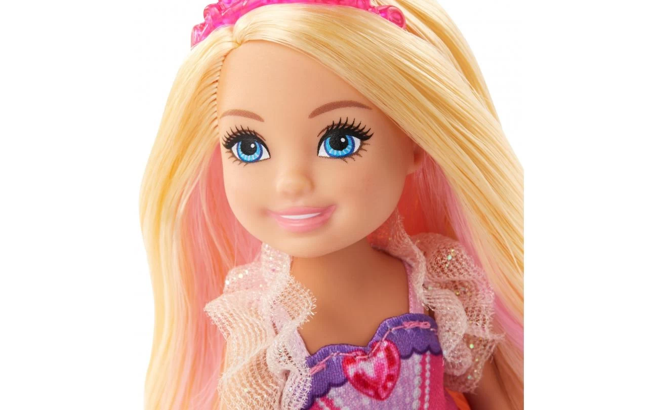 Help Chelsea wanneer ze haar schattige eenhoornvriendjes (een roze en een paarse) de fles geeft. De Chelsea prinsessenpop is gekleed voor een koninklijke gelegenheid met een glinsterende roze jurk met hartjesprint. De mouwen met ruches, de edelsteentjes en de strik bij de taille zorgen voor nog meer fantasievolle speelmogelijkheden.