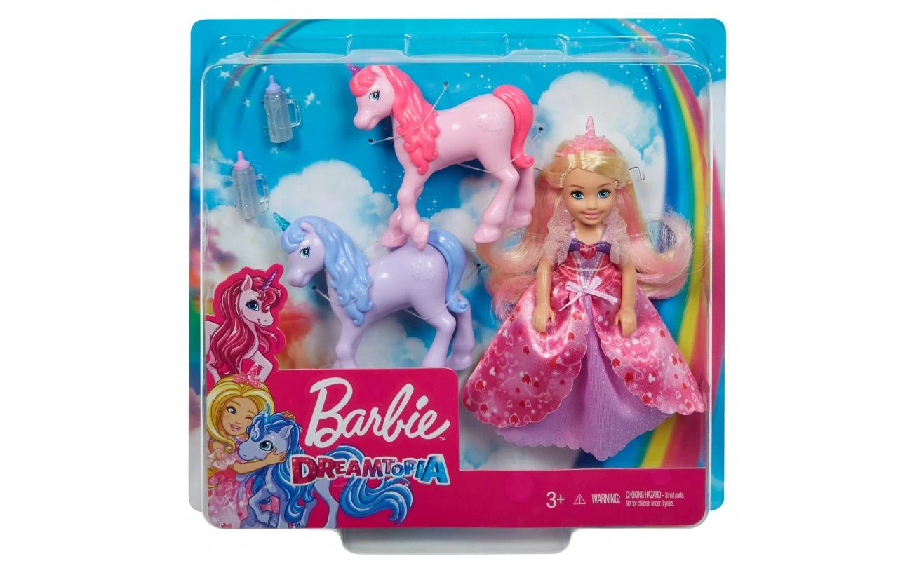 Bedenk de schattigste verhalen met deze Barbie Dreamtopia cadeauset met twee baby-eenhoorns en een Chelsea prinsessenpop in een sprookjesachtige outfit!