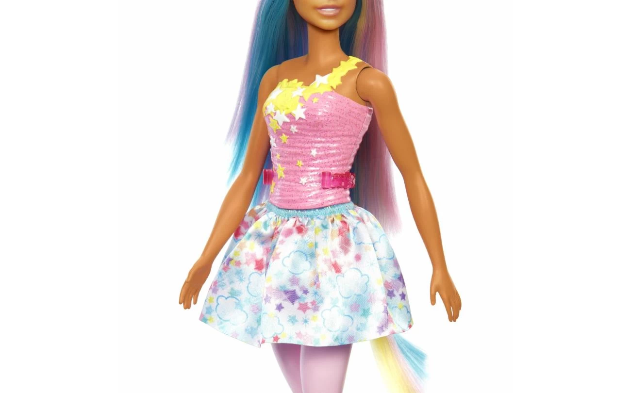 Welkom in een wereld vol magische verhalen met Barbie Dreamtopia eenhoornpoppen! Deze Barbie pop heeft sprankelende regenboogkleuren, compleet met blauw en roze fantasiehaar, een glittertop en verwijderbare rok met een wolken- en sterrenprint. Met de clip-on staart en de glinsterende eenhoornhoofdband met schattige oortjes kunnen kinderen deze Barbie pop veranderen in hun favoriete sprookjeswezen! Kleurrijke schoenen en een opgeschilderde panty zorgen voor nog meer fantasie en plezier. Met hun levendige looks en fantastische verandermogelijkheden inspireren Barbie Dreamtopia eenhoornpoppen tot eindeloze avonturen voor kinderen vanaf 3 jaar. Per stuk verkrijgbaar en niet overal leverbaar. Pop kan niet los staan. Kleuren en versieringen kunnen afwijken.