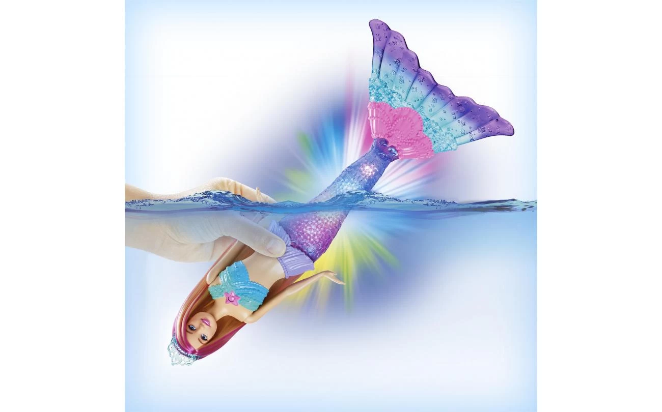 - Dompel deze Barbie zeemeerminpop in water onder om haar schitterende staart op te laten lichten met een van de vier kleurrijke lichtshows.