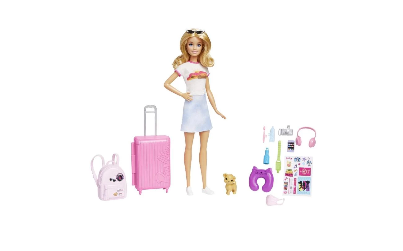 Barbie ‘Malibu’ Roberts staat klaar om met haar puppy en meer dan 10 reisaccessoires naar haar volgende bestemming te vertrekken. Met het stickervel kunnen kids haar rolkoffer – die echt open en dicht kan – versieren. Pak haar koffer en haar rugzak in met alles wat je op reis nodig hebt en speel je favoriete momenten na of verzin nieuwe avonturen. Deze Barbie pop, geïnspireerd op It Takes Two, prikkelt de fantasie en is dan ook een geweldig cadeau voor kinderen vanaf 3 jaar. Pop kan niet los staan. Kleuren en versieringen kunnen variëren.