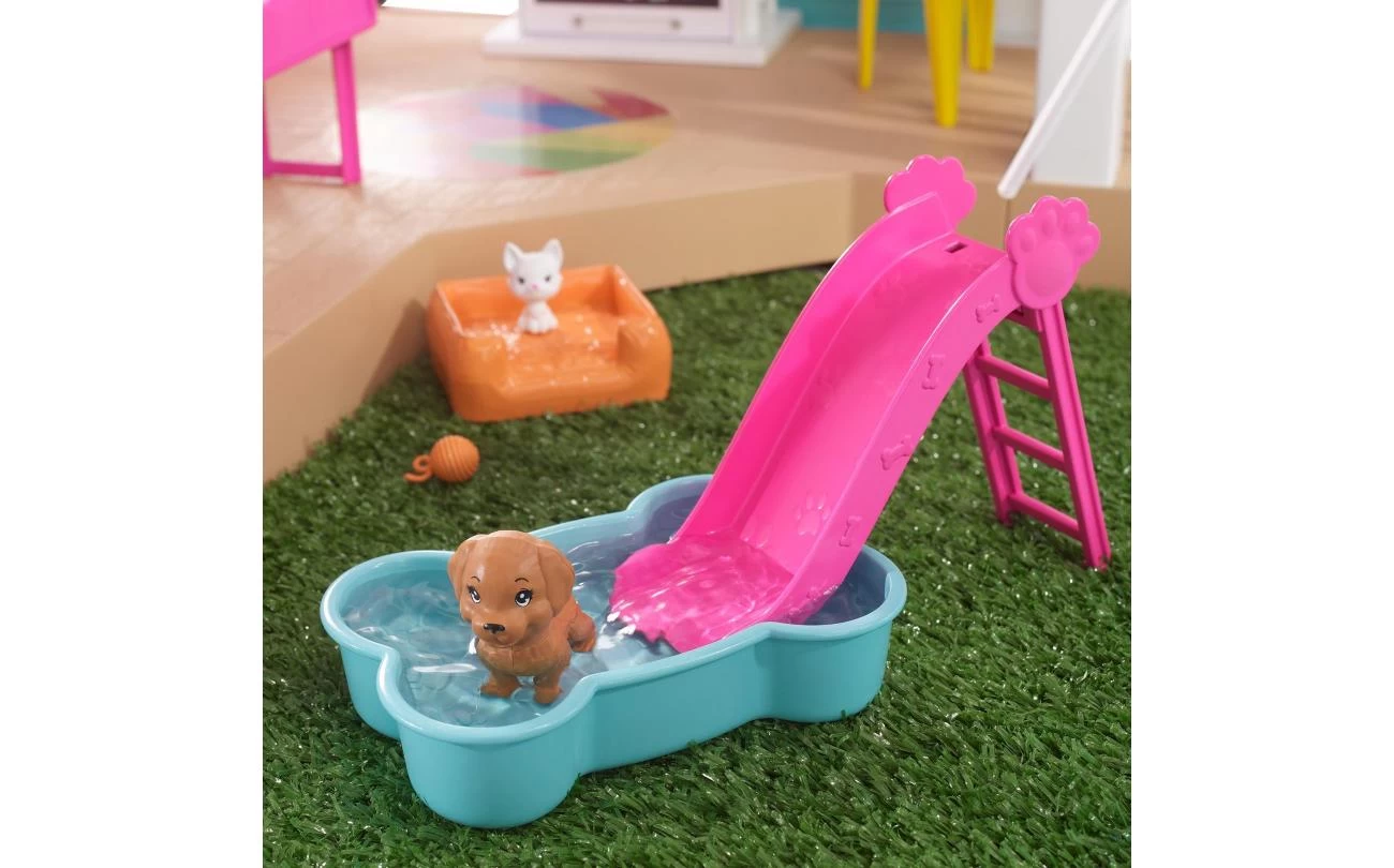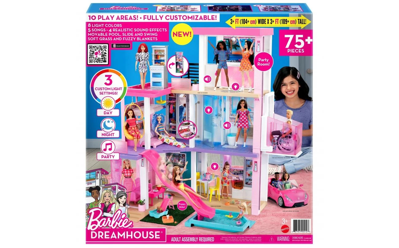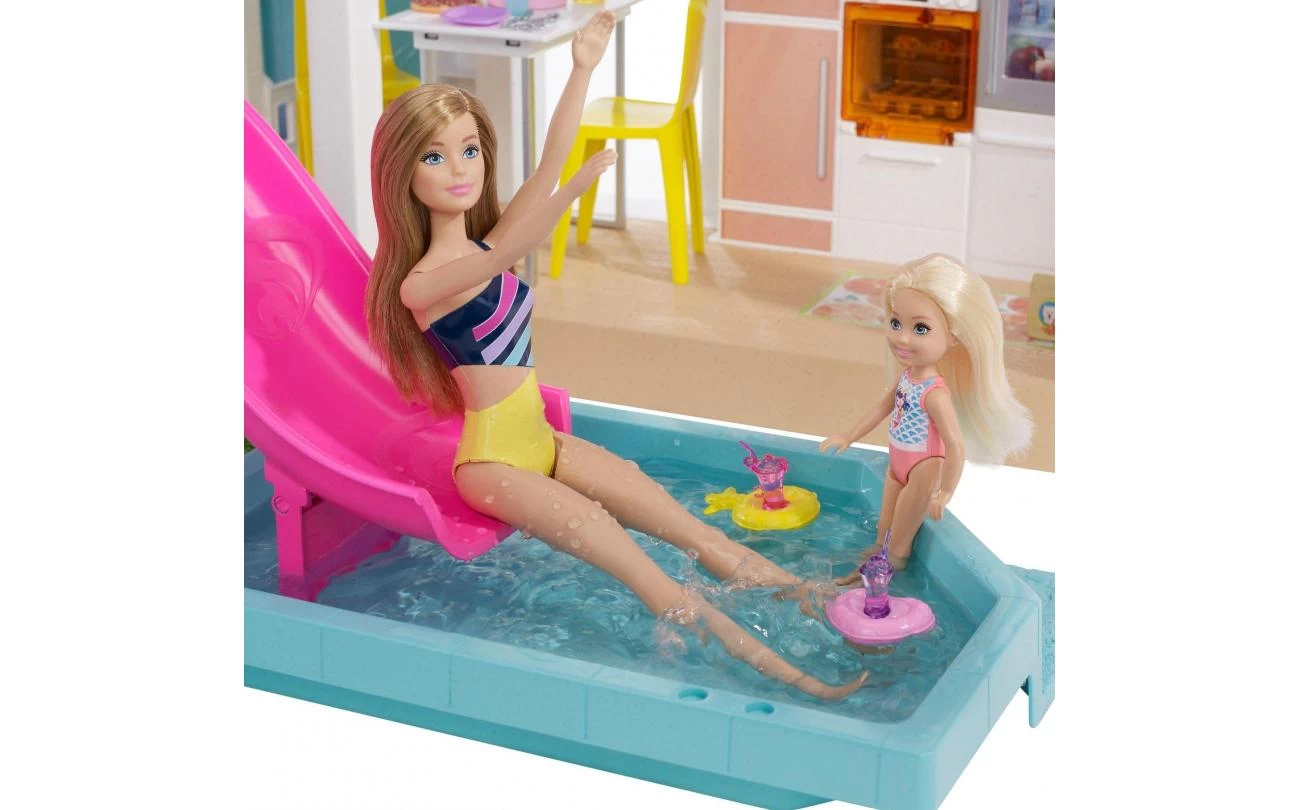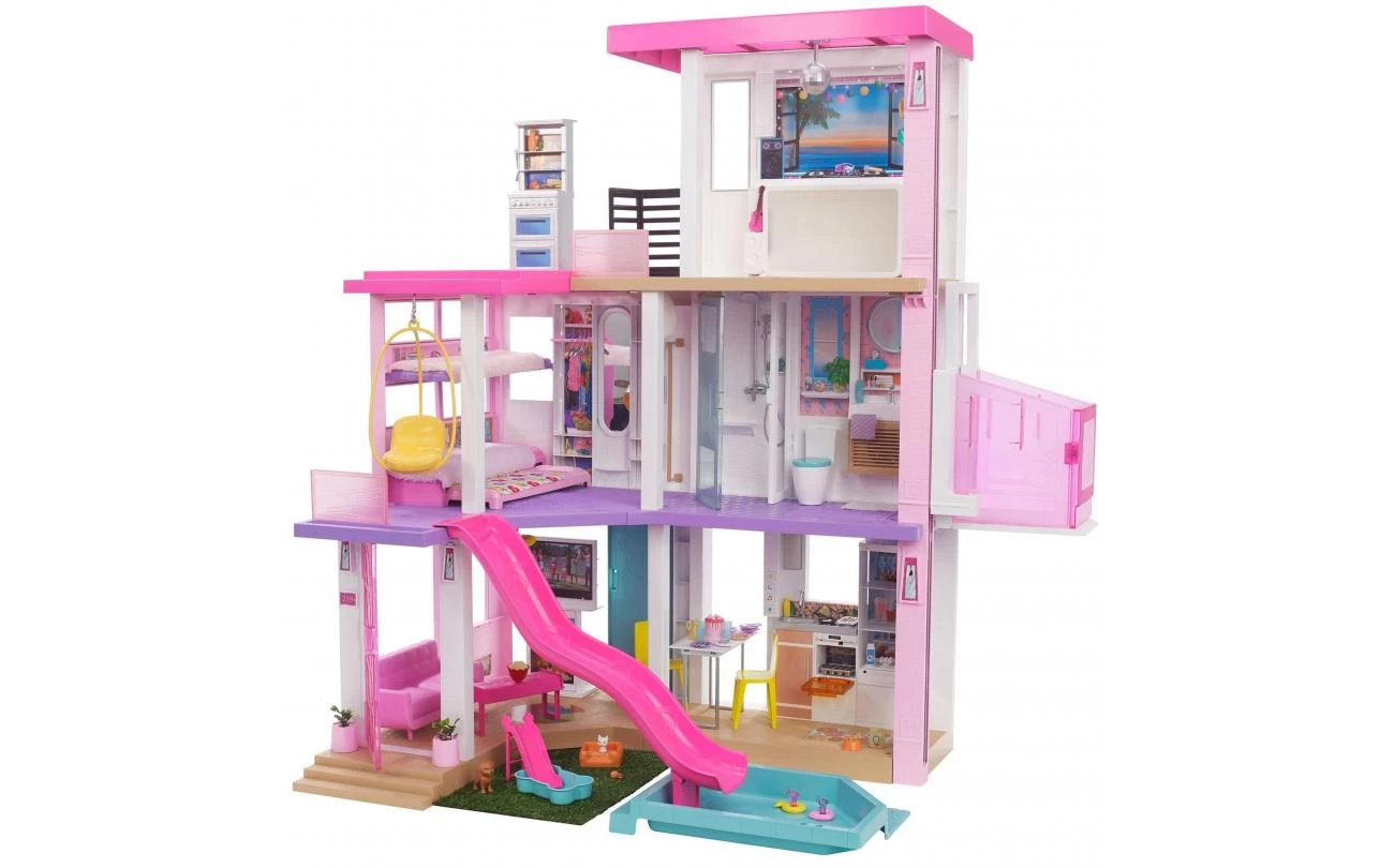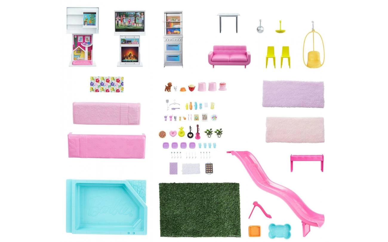 Dit dromerige poppenhuis is 109 cm hoog en 104 cm breed en heeft 3 verdiepingen en 10 binnen- en buitenspeelplekken aan alle kanten. Laat je fantasie de vrije loop: het gras en het zwembad kunnen op meerdere manieren op de eerste en derde verdieping worden geplaatst en de glijbaan past op 4 plekken op de tweede verdieping. Nadat je het droomhuis hebt ingericht, kun je dankzij de 3 liedjes, de 2 soundscapes en de aanpasbare lichtinstellingen de leukste verhalen verzinnen! Verdubbel de pret door de meubels om te draaien: de barbecue wordt een toetjesbuffet, het entertainmentcenter wordt een speelzone voor huisdieren en het stapelbed kan uitgeklapt worden.