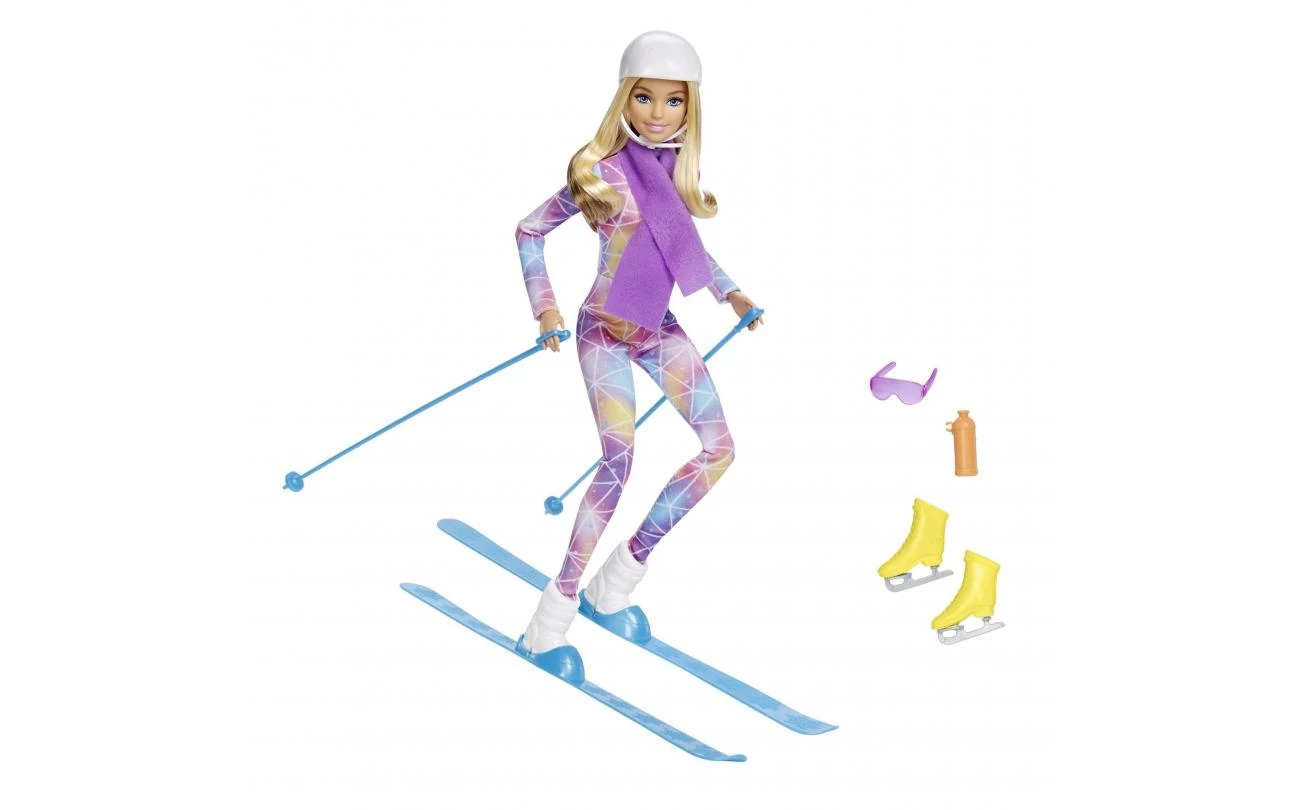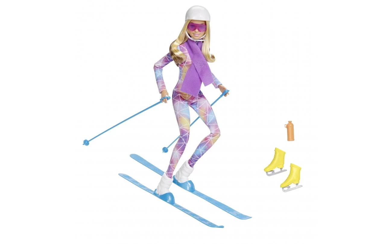 - Barbie® pop kan het ijs op in een paar gele schaatsen, of haar laarzen in haar ski’s schuiven en haar stokken pakken om de hellingen af te scheuren.