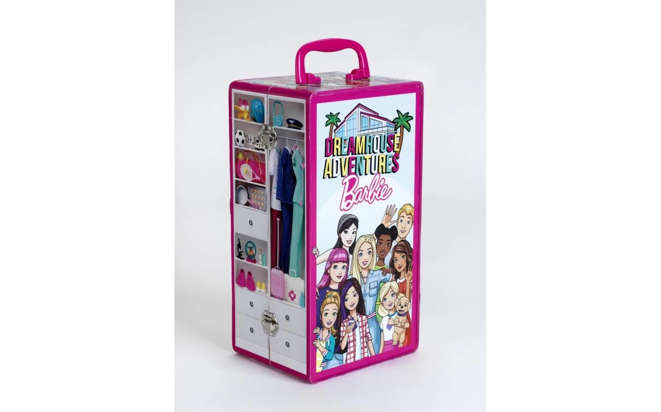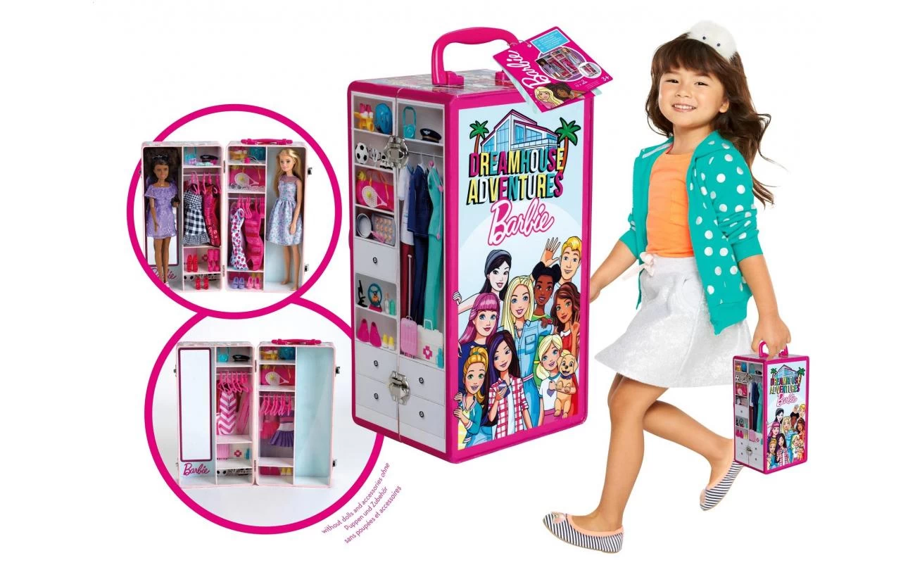 Barbie kleerkast koffer die je makkelijk kan dichtklappen en mee kan nemen. Hang je kleding en accessoires erin, poppen erbij en vertrekken maar.