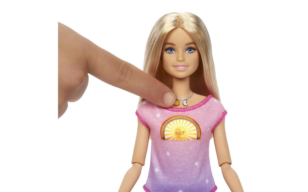 Kids kunnen mindfulness en meditatie oefenen met de Barbie Mediteren en Ontspannen pop, om zich overdag ontspannen te voelen en ’s avonds gemakkelijker in slaap te vallen! Deze volledig beweegbare pop geeft licht en laat kalmerende muziek horen en wel in 2 verschillende standen: Dag en Nacht. Druk op het zonnetje op de ketting van Barbie en doe ademoefeningen in de dagstand. Druk op het maantje op de ketting voor de nachtstand om te ontspannen en in slaap te vallen. De pop (ca. 29 cm) heeft ook een oogmasker en een puppy. Kinderen kunnen 3 verschillende emoticonspeldjes op de puppy prikken om te laten zien hoe hun stemming is. Pop kan niet los staan. Kleuren en versieringen kunnen variëren. Voor kinderen vanaf 3 jaar.