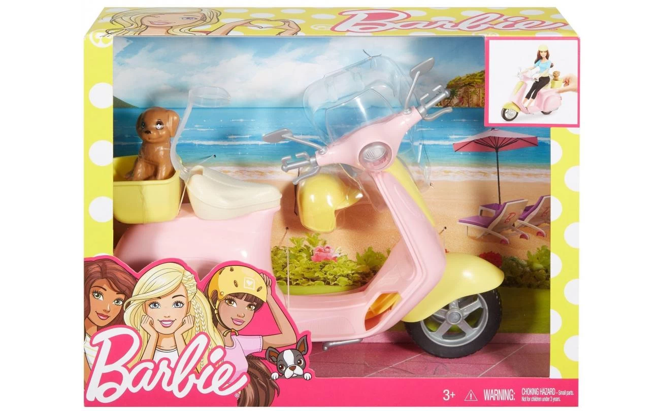 Inclusief: Barbie-scooter met mandje, puppy en helm.