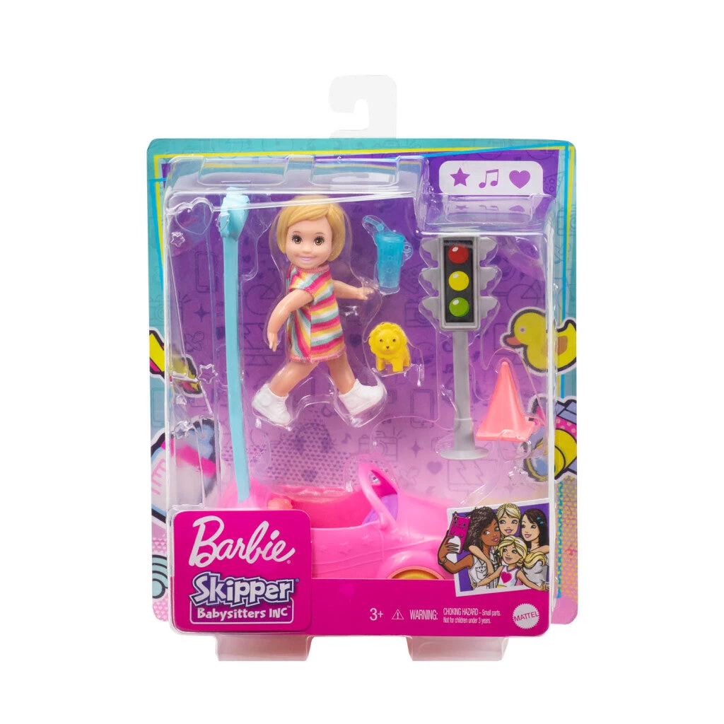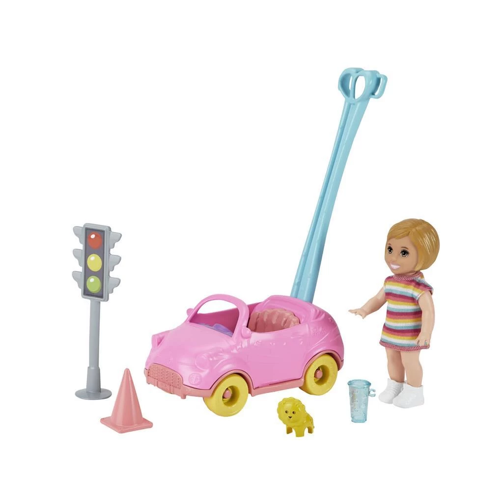 Barbie Skipper Babysit Set. Peuterpop met auto met leuke accessoires, zoals een verkeerslicht, een beker en een leeuwtje.
