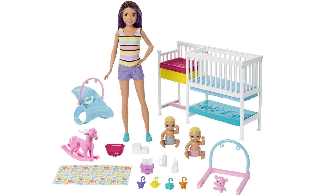 Met de Barbie Skipper Babysitters Inc. poppen en speeltjes kunnen kinderen hun verzorgende kant leren ontdekken door in de rol van babysitter te kruipen. Deze kinderkamerspeelset van Skipper stimuleert kinderen om de touwtjes in handen te nemen, zodat ze de Skipper pop gaan meehelpen bij de verzorging van de twee schattige babypoppen.