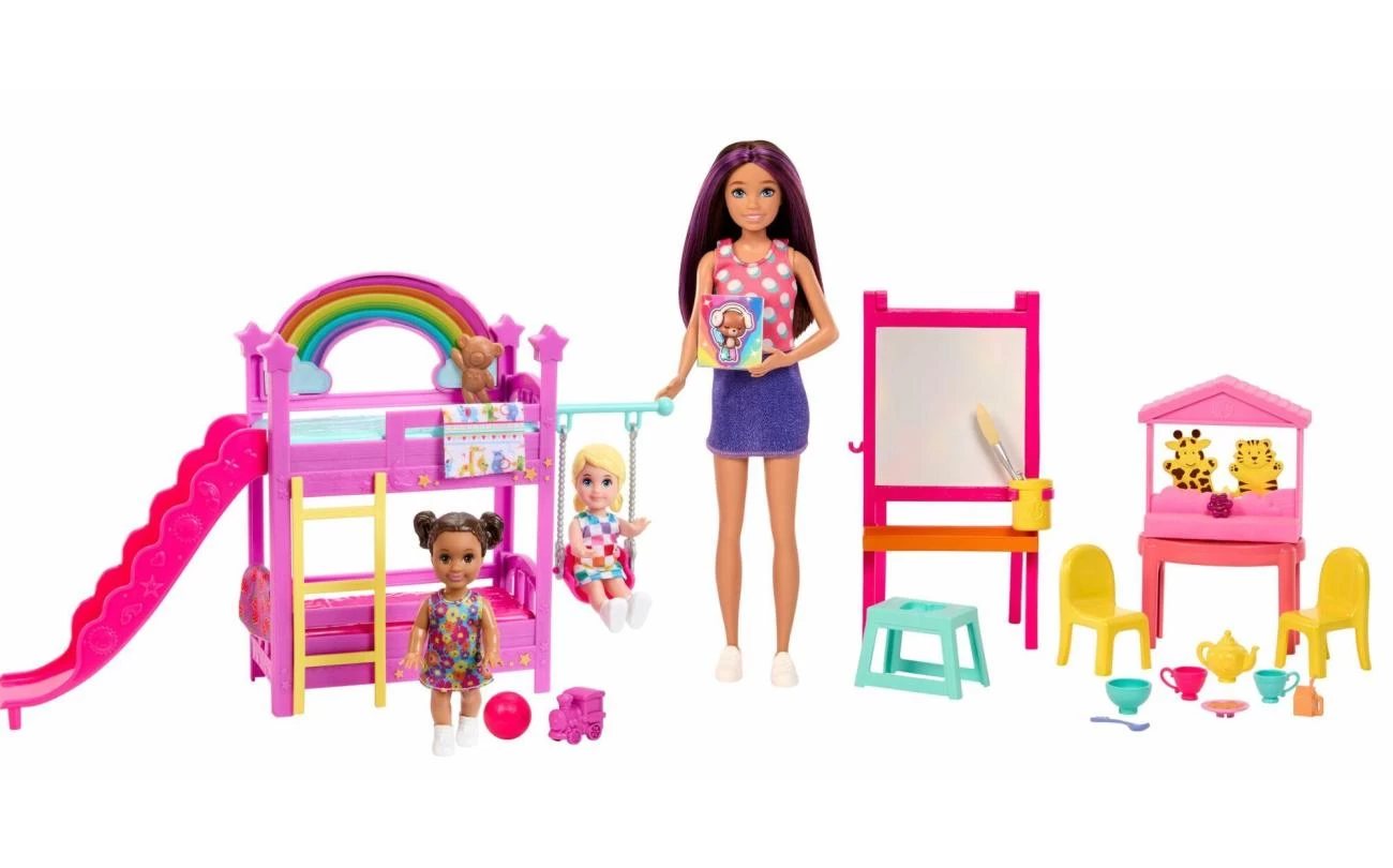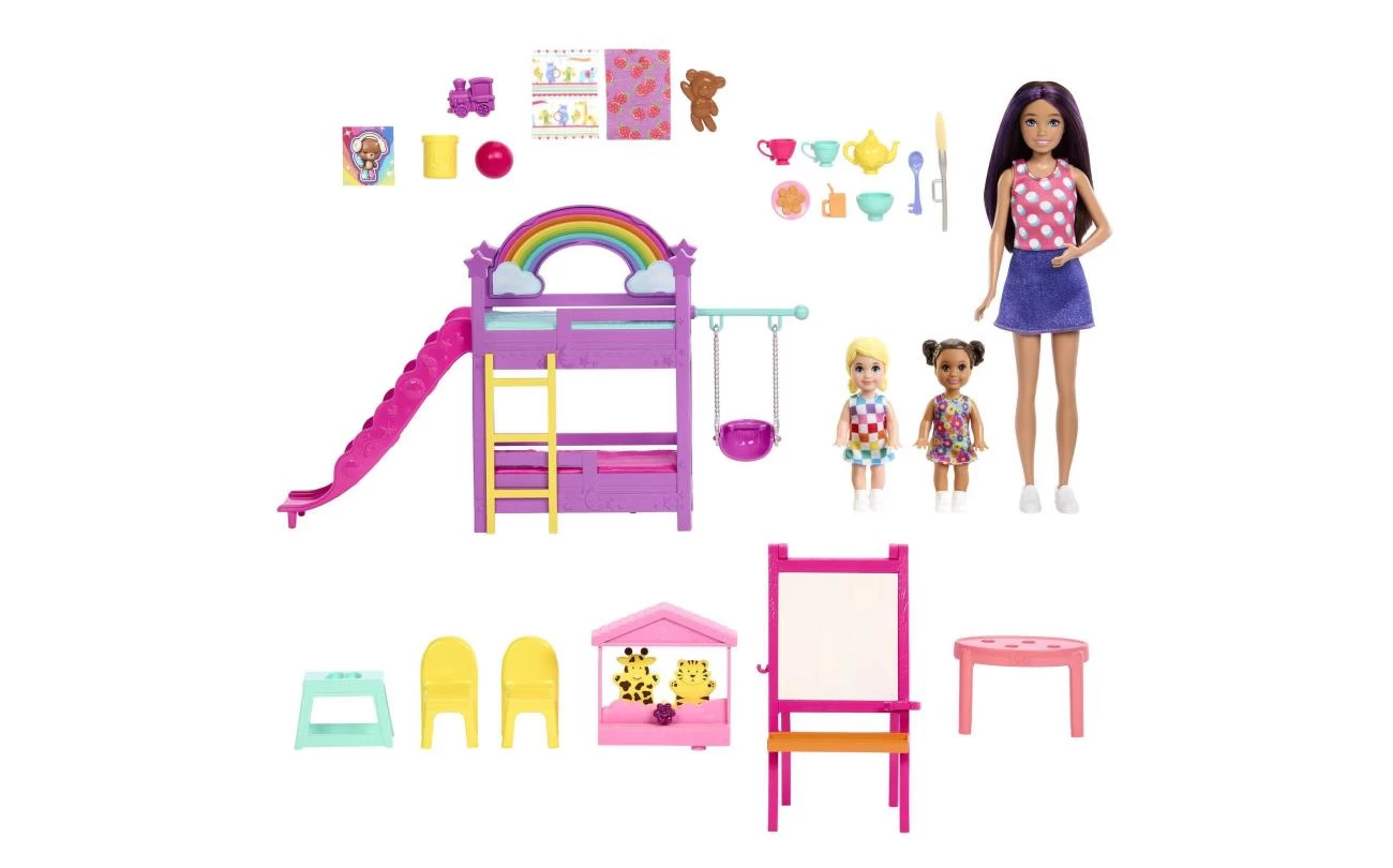 - Met 3 poppen en meer dan 15 onderdelen, waaronder meubels en accessoires, zijn er talloze verhalen te vertellen in deze speelset met dagopvangthema van Barbie Skipper Eerste Baantjes!