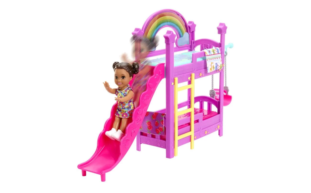 Met de Barbie Skipper Eerste Baantjes poppen en speelsets kunnen kinderen de werkende wereld verkennen met het tienerzusje van Barbie. Deze set, de dagopvang, is genspireerd op de film Skipper and the Big Babysitting Adventure en bevat een Skipper pop als verzorger, twee kleine peuterpoppen, meubels en meer dan 15 accessoires die je op de opvang vindt. Kids kunnen allerlei activiteiten ondernemen, zoals een mooi schilderij maken op de schildersezel, aan tafel gaan zitten voor een kopje thee, een poppenkastvoorstelling geven, schommelen en van de glijbaan afglijden. Na al het speelplezier is het tijd voor een dutje in het stapelbed. Met zo veel activiteiten die de fantasie prikkelen, is deze speelset een perfect cadeau voor kinderen en jonge verzorgers vanaf 3 jaar. Poppen kunnen niet los staan. Kleuren en versieringen kunnen variren.