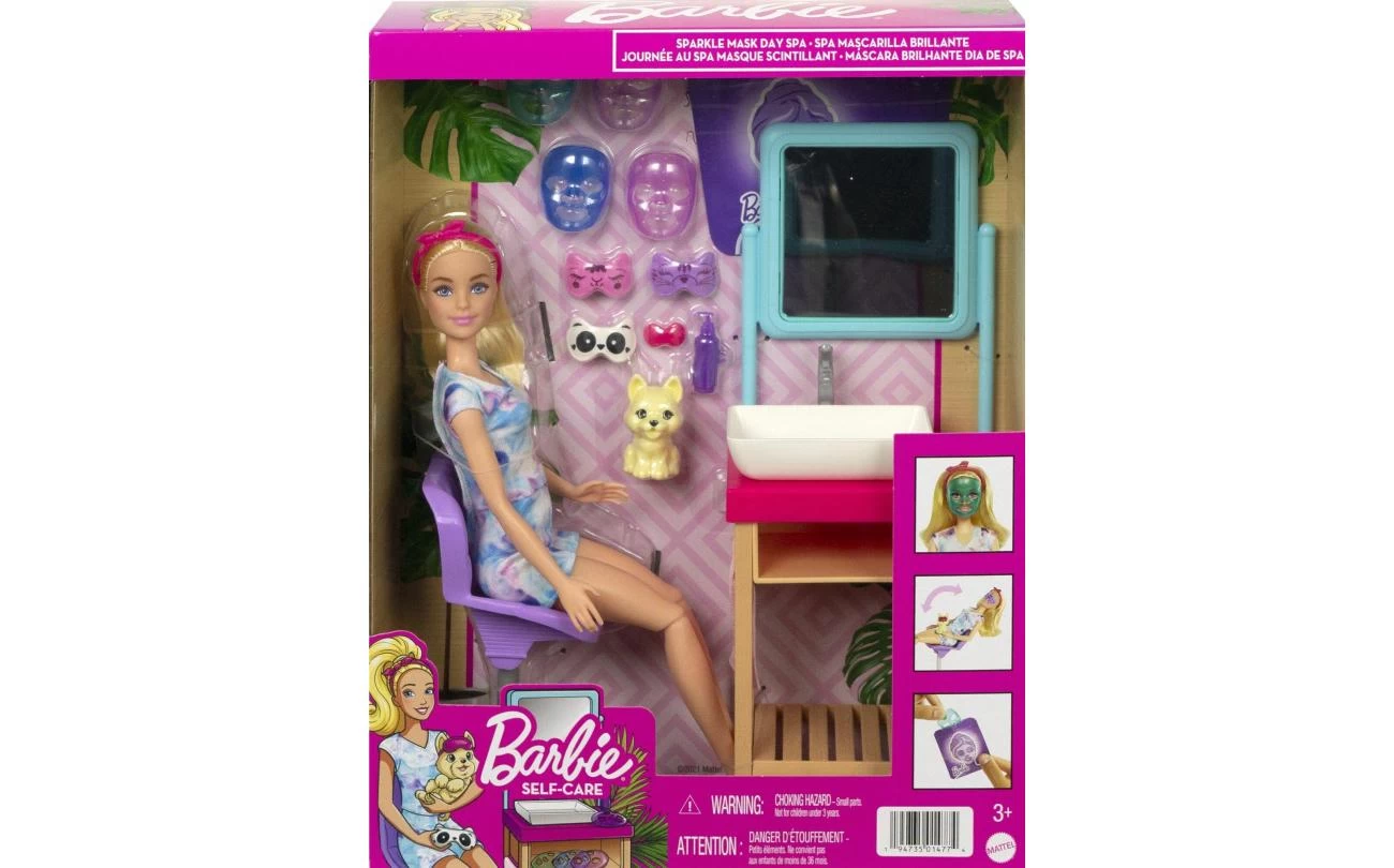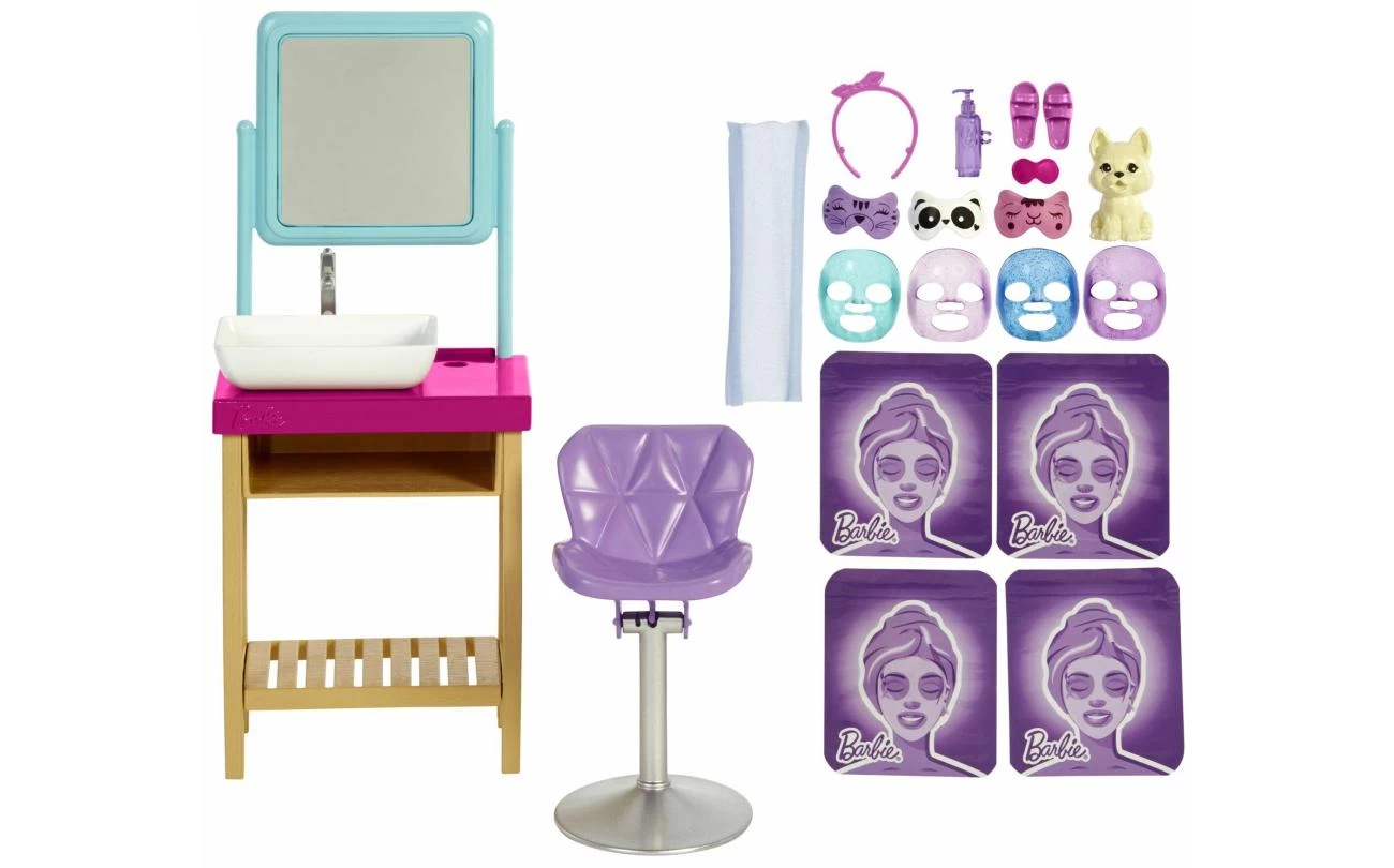 - Inhoud: Barbie pop, puppy met oogmasker, wastafel en spiegel, kantelbare stoel, handdoek, 4 gezichtsmaskers, 4 hersluitbare zakjes, 3 oogmaskers met dierenthema, een lotionfles, slippers en hoofdband.