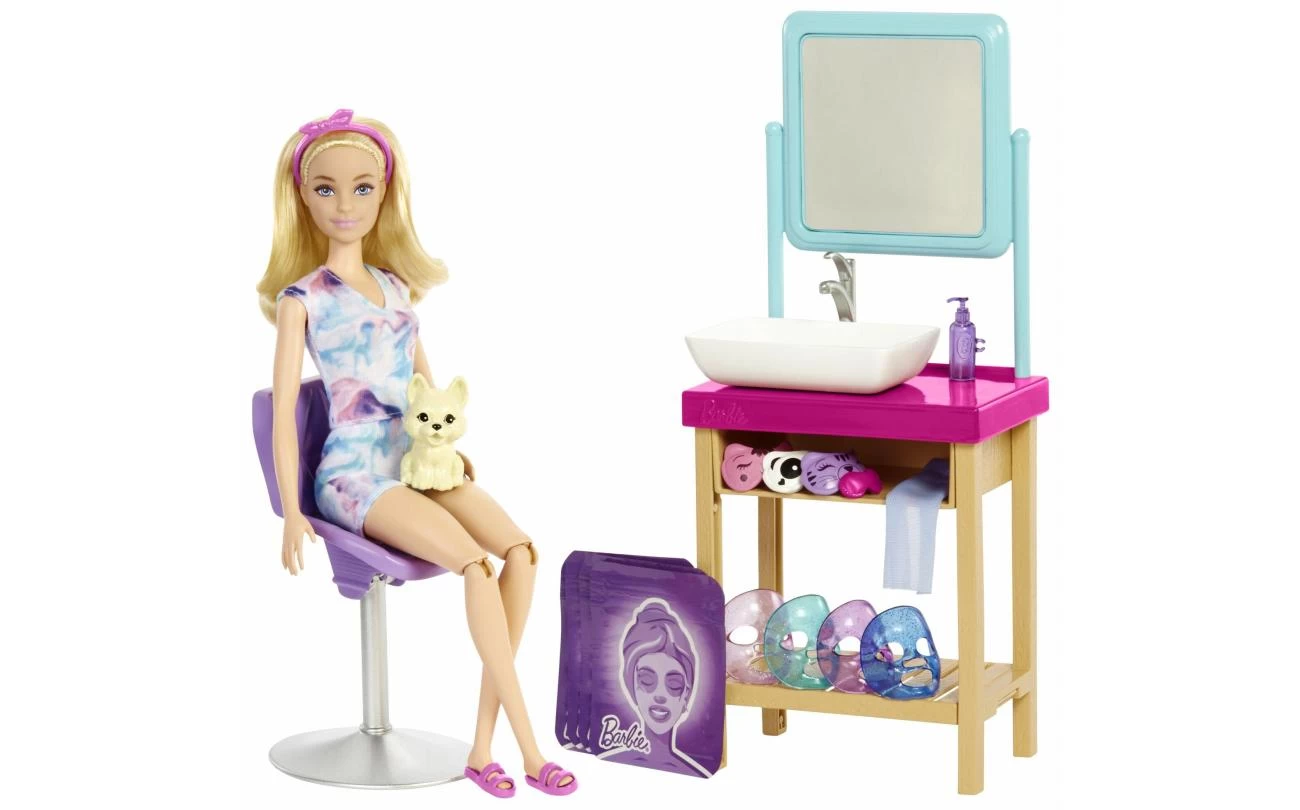 - De speelset wordt geleverd met een Barbie pop (29,2 cm) met buigbare knieën, een puppy met oogmasker, kaptafel, wastafel en meer. In totaal meer dan 15 accessoires om een ontspannende gezichtsverzorging na te bootsen.